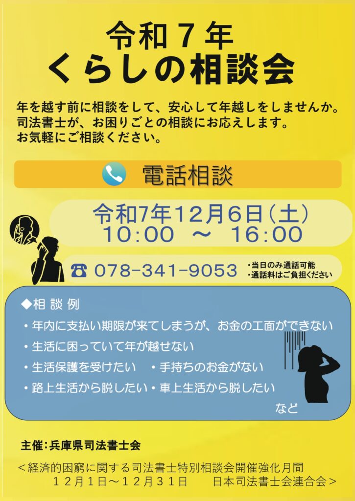 兵庫県司法書士会では、市民の皆様が安心して年を越せるよう、下記のとおり「令和7年くらしの相談会」(電話相談)を実施いたします。
